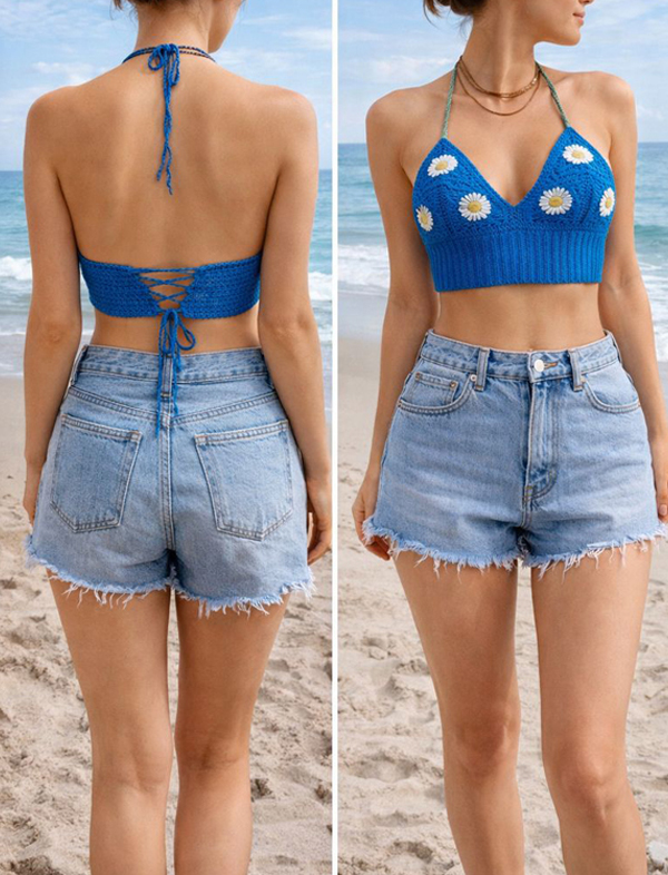 Sky Blue Crochet Ballet Flats with Pom-Pom & Pearl